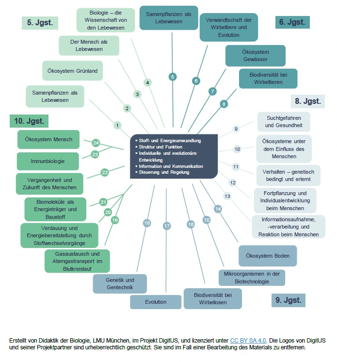 In der Mittelschule verteilen sich die Basiskonzepte Biologie über alle Schuljahre, da im Fach NuT auch Basiskonzepte aus der Physik und Chemie in jeder Jahrgangsstufe behandelt werden.