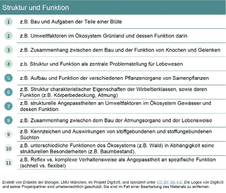 Häufig findet man in der Literatur eine weitere Unterteilung, die die Basiskonzepte der Biologie in acht Bereiche gliedert. Die nachfolgende Tabelle gibt Ihnen einen Überblick über die einzelnen Konzepte, sowie eine Auflistung konkreter Beispiele: