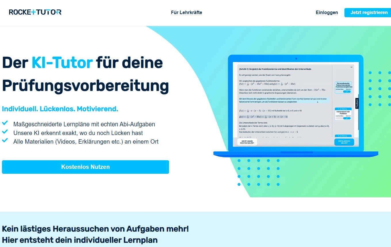 Ein weiteres Beispiel ist RocketTutor – eine kostenfreie Lernapp, die Schülerinnen und Schüler bei der Abiturvorbereitung unterstützt. Es müssen Abituraufgaben analog gelöst werden, wobei gestufte Lernhilfen angeboten werden. Anschließend können Lernlücken gemeldet werden und der KI-Algorithmus berücksichtigt diese beim individuellen Lernplan. (Rockettutor UG, 2023)