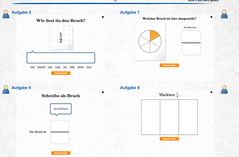 Möchten Sie das Thema Brüche in Ihrer Klasse einführen oder wiederholen, dann setzen Sie das interaktive Buch in verschiedenen Phasen des Unterrichts (ggf. auch als Hausaufgabe) ein. Die Inhalte können jahrgangsübergreifend zum Wiederholen und Festigen des Konzepts Bruchteile verwendet werden.