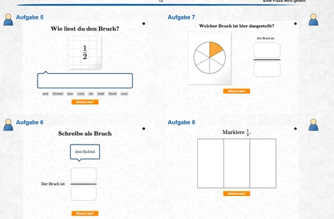 Möchten Sie das Thema Brüche in Ihrer Klasse einführen oder wiederholen, setzen Sie das interaktive Buch in verschiedenen Phasen des Unterrichts (ggf. auch als Hausaufgabe) ein. Die Inhalte können jahrgangsübergreifend zum Wiederholen und Festigen des Konzepts Bruchteile verwendet werden.