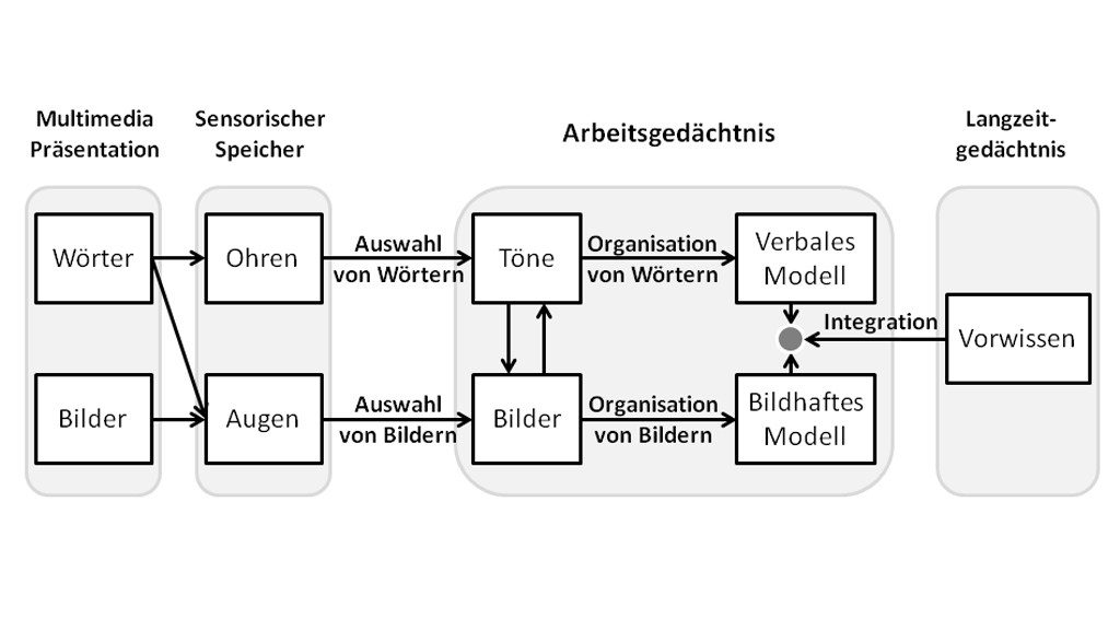 Richard E. Mayer entwickelte die Cognitive Theory of Multimedia Learning (CTML) bzw. die Kognitive Theorie multimedialen Lernens. Dieses Modell erklärt die Verarbeitung von Informationen im Gedächtnis und gibt damit einige wichtige Hinweise zur Gestaltung von Lernmaterialien. Eine Grundannahme der CTML, die relevant ist für die Darbietung von Informationen für Lernende, ist, dass es zwei Kanäle für die Informationsverarbeitung gibt: