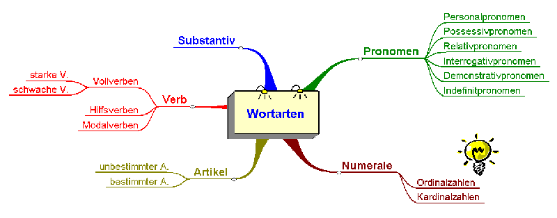 Nur bei völliger Unkenntnis des Programms ist eine kurze Einführung in dessen Funktionaliät vorauszuschicken. Besonders leistungsfähige Schülerinnen und Schüler können die Mindmap mit Wortbeispielen und Angaben zu den Flexionssmöglichkeiten der jeweiligen Wortarten ergänzen.
