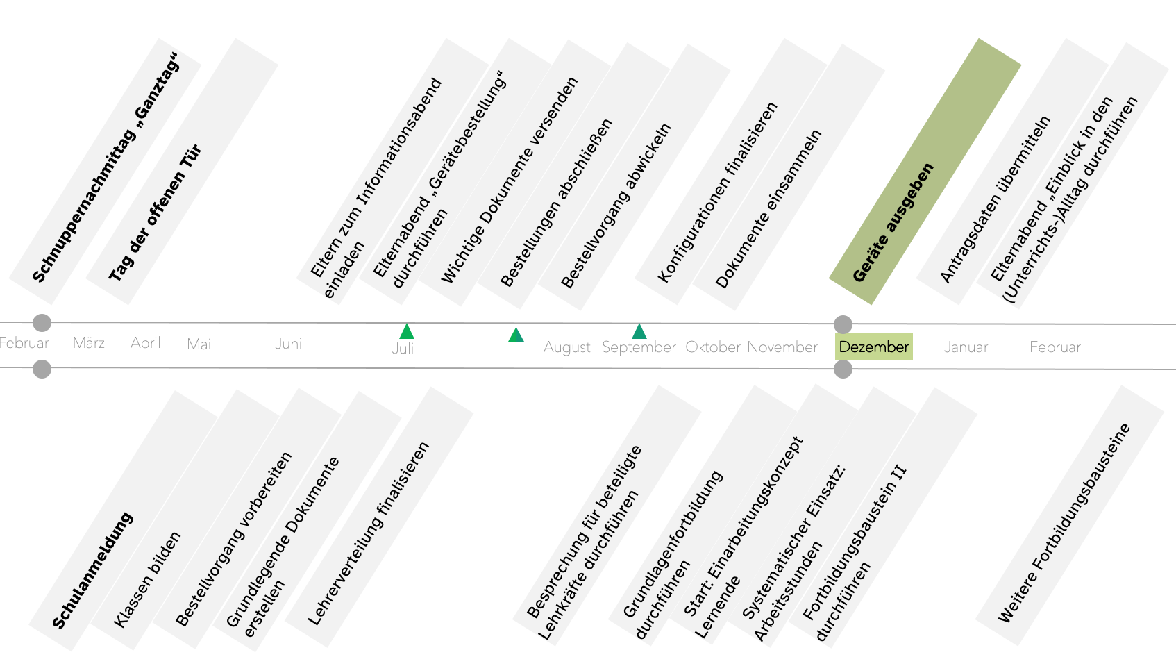 "Die Ganztagsklassen werden bereits in der Jahrgangstufe 5 mit Geräten ausgestattet. Die Regelklassen starten in Jahrgangstufe 6. In der Zeitplanung werden als Fixpunkte jeweils die Klassenbildungen, die Gerätebestellung und die Geräteausgabe gesetzt. In den Ganztagsklassen werden die Geräte bereits ab Jahrgangstufe 5 zielgerichtet in den Arbeitsstunden und Lernmodulen eingesetzt. In den Regelklassen stehen weniger Stunden zur Verfügung; einzelne Anwendungen werden jedoch gezielt über den Einsatz von Tabletkoffern vorbereitet und erst zu Beginn der Jahrgangstufe 6 der Fokus auf die neuen Geräte aufgespielt.