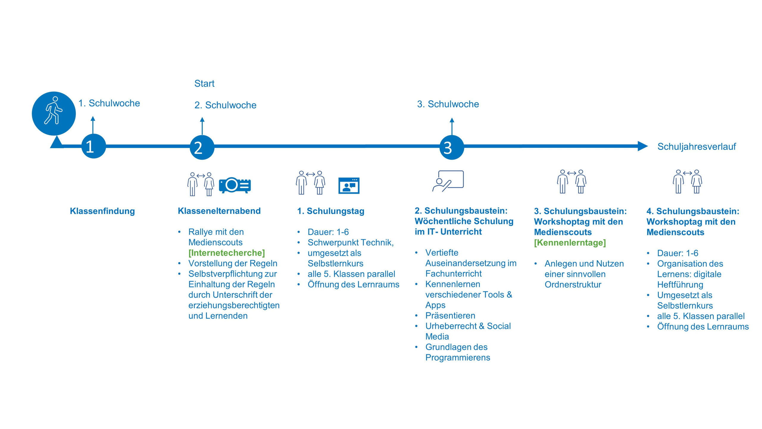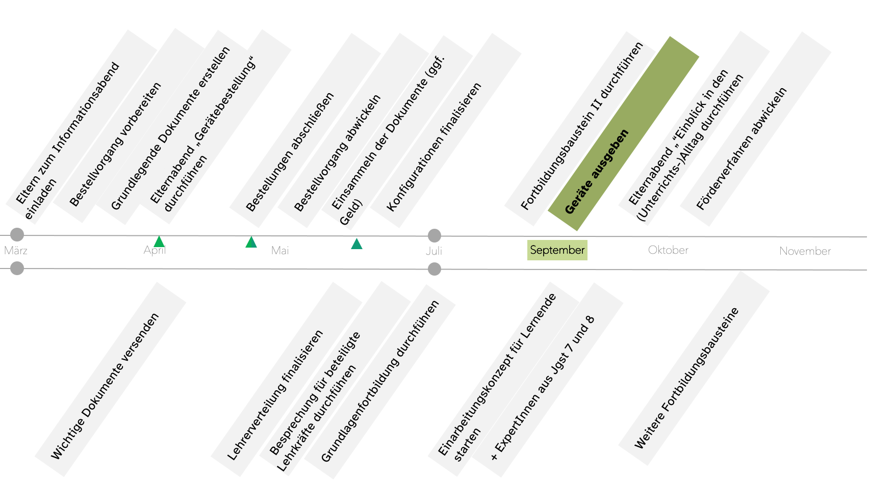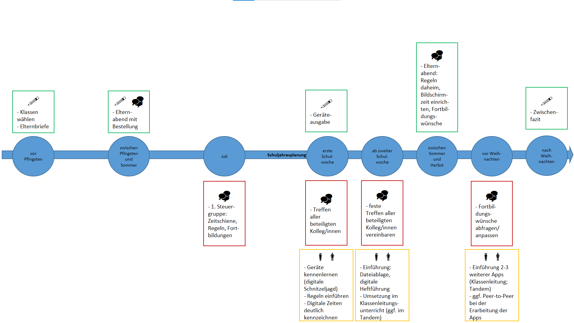 Bereits vor den Sommerferien sollten die Klassenleitungen feststehen, deren Klassen im kommenden Schuljahr eine 1:1-Ausstattung erhalten. Ein Treffen aller Beteiligten vor Ende des Schuljahres ist sinnvoll, um erste Rahmenbedingungen anzusprechen. Im gesamten Schuljahresverlauf finden regelmäßige Austauschtreffen statt, um alle Kolleginnen und Kollegen ‚mitzunehmen‘ und auf mögliche Schwierigkeiten frühzeitig gemeinsam reagieren zu können.