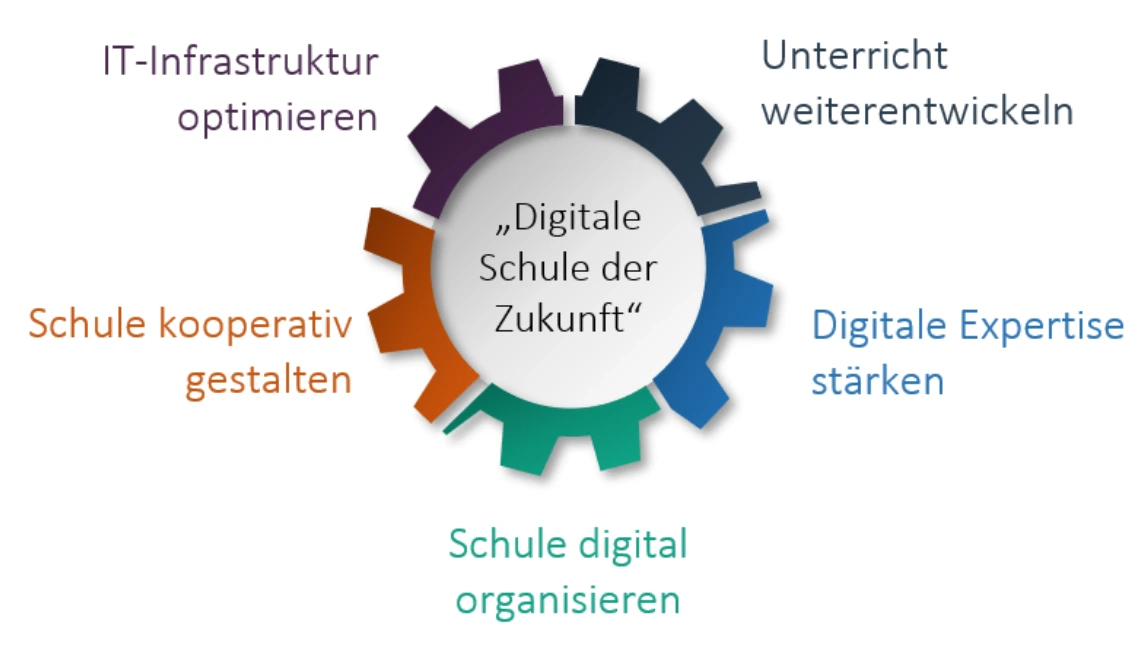 Neben dem Potenzial ist auf der Ebene des Unterrichts ergeben sich mit der 1:1-Ausstattung Chancen für die gesamte Schulgemeinschaft und deren künftige Entwicklung. Im Zuge der digitalen Schulentwicklung sind dabei fünf Handlungsfelder in den Blick zu nehmen.
