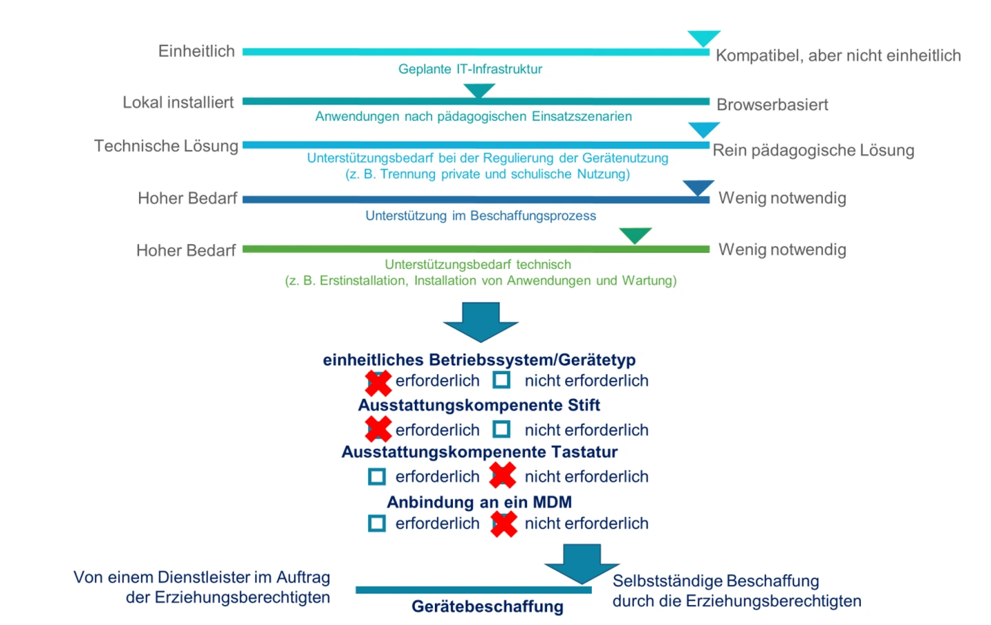 Die einheitlichen Geräte schaffen auch bei technisch unerfahrenen Lehrkräften größere Sicherheit, da sie sich nur mit einem Betriebssystem auseinandersetzen müssen, z. B. bei Unterstützungsbedarf im Unterricht, Störungen, Bedienung der Technik im Klassenzimmer, Nutzung von Apps und Anwendungen usw.