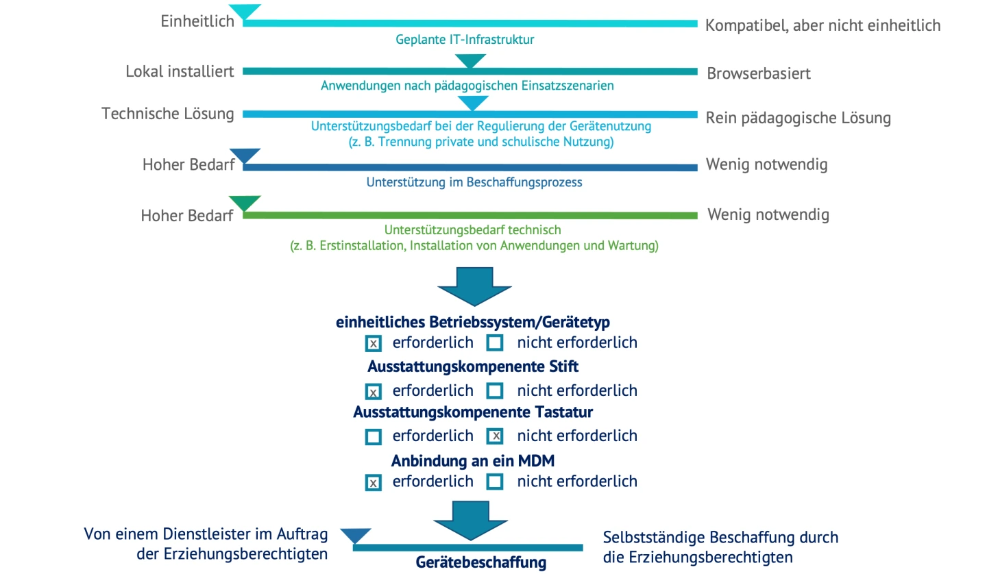 Für den Beschaffungsprozess arbeiten wir mit einem Händler zusammen, der für die Erziehungsberechtigten einen Online-Shop einrichtet, bei dem diese das passende Gerät bestellen können. Die Beschaffung selbst erfolgt damit eigenständig durch die Erziehungsberechtigten. Nachdem diese auch die Möglichkeit haben, Geräte bei einem anderen Anbieter zu kaufen, ist vereinzelt eine manuelle Einbindung in das von uns genutzte MDM erforderlich. Dieser Prozess tritt auch ein, wenn Lernende während des Schuljahres neu eintreten.