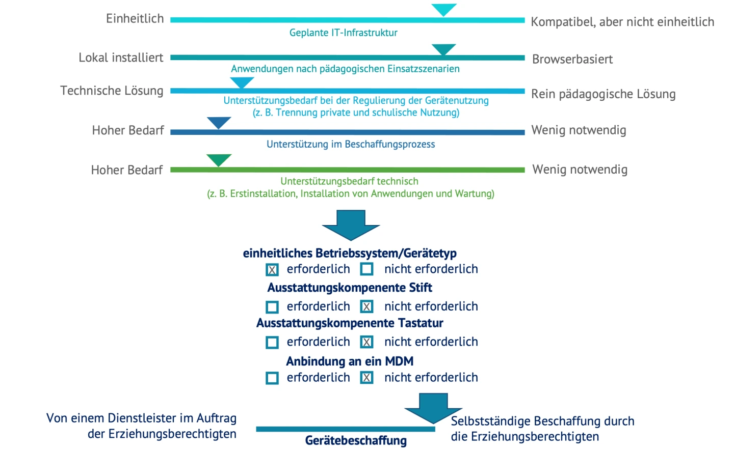 Als Unterstützung für die Eltern und Erziehungsberechtigten stellt die Schule vor der Gerätebestellung Empfehlungen im technischen Bereich zur Verfügung. Es wird außerdem empfohlen, schulische und private Anwendungen auf dem Gerät zu trennen. Eine Liste mit Anwendungen, die die Schülerinnen und Schüler installieren sollen, wird verteilt und laufend aktualisiert.