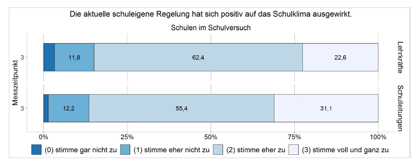 Verbessertes Schulklima: Die schuleigene Regelung über die Nutzung mobiler Endgeräte hat einen positiven Effekt auf das Schulklima. Rund 80 % der Schulleitungen und die am Schulversuch beteiligten Lehrkräfte sind einhellig der Auffassung, dass sich das Klima an ihrer Schule durch die neuen Regelungen verbessert hat.