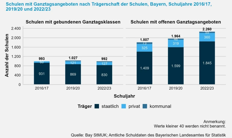 Eine in diesem Kontext relevante Entwicklung ist der Wandel der Schule vom Lern- zum Lebensort. Bereits seit den 1980er-Jahren ist die Schule die zentrale Bezugsgröße im Leben fast aller Kinder und Jugendlichen. Neben der Familie und der Nachbarschaft ist sie eine immer wichtiger werdende Sozialisationsinstanz und Ausgangspunkt für viele außerschulische Kontakte (Büchner/Krüger, 1996). Verstärkt wurde diese Entwicklung durch den flächendeckenden Ausbau von Ganztagsangeboten. So stieg laut Bayerischem Bildungsbericht die Zahl der Schulen mit gebundenen Ganztagsklassen von 28 im Schuljahr 2002/03 auf 992 im Schuljahr 2022/23 und die der Schulen mit offenen Ganztagsangeboten von 365 auf 2.260 im selben Zeitraum.
