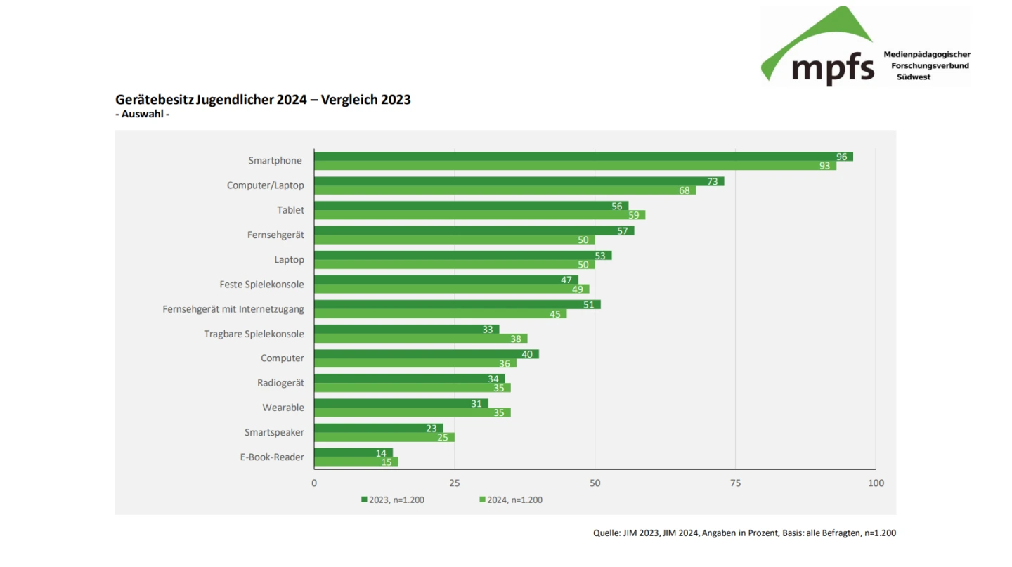 Smartphone und Internet sind heute fester Bestandteil der Lebenswelt von Kindern und Jugendlichen. Unter den Zwölf- bis 19-Jährigen besitzen 96 % ein eigenes Handy/Smartphone und drei Viertel (zusätzlich) einen PC oder Laptop (JIM-Studie 2024). Digitale Medien gewinnen nicht nur im Schulunterricht zunehmend an Bedeutung, sondern sind mittlerweile zentrale Voraussetzung für die soziale Teilhabe insbesondere von Kindern und Jugendlichen.