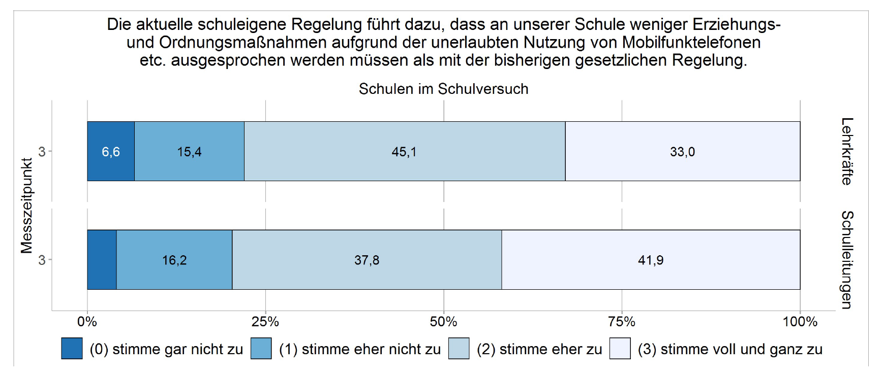 Weniger Konflikte und Verstöße: Schulleitungen und Lehrkräfte stimmen darin überein, dass es seit Einführung der schuleigenen Regelungen zu weniger Problemen hinsichtlich der Nutzung von Handys und anderer digitaler Endgeräte gekommen ist. Die Schülerinnen und Schüler gaben an, dass sie ihr Handy jetzt seltener ohne Aufforderung durch die Lehrkraft nutzen. Dies hatte eine Entlastung der Lehrkräfte zur Folge, die weniger Erziehungs- und Ordnungsmaßnahmen aussprechen mussten.