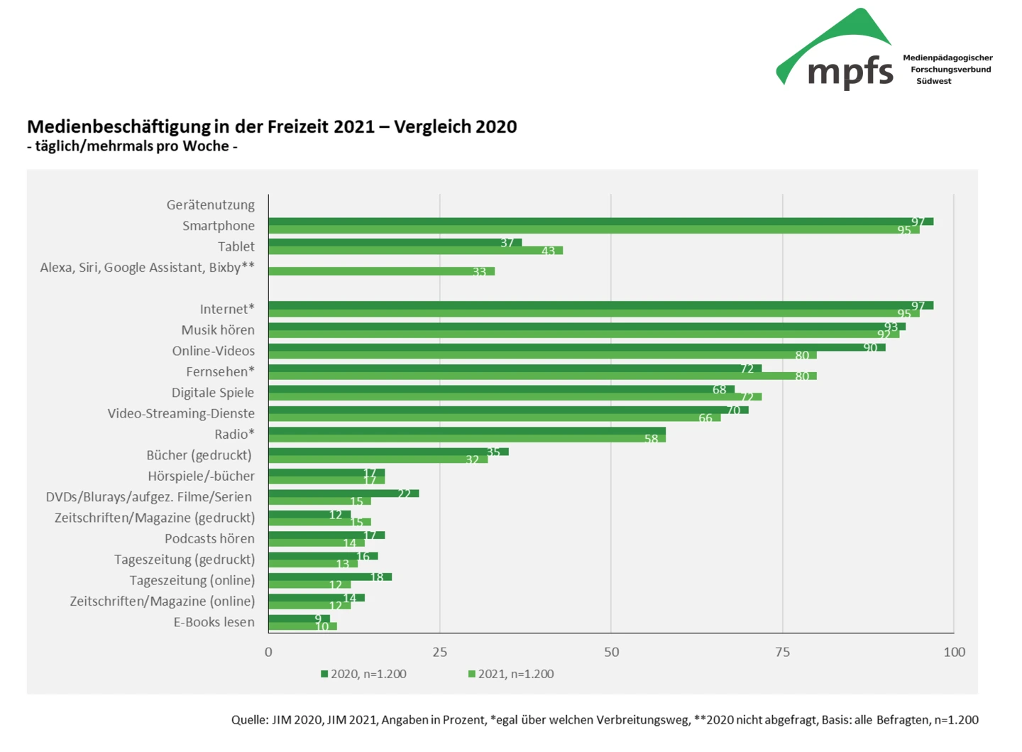 Feierabend Sabine, Rathgeb Thomas, Reutter Theresa (2021): JIM-Studie 2021.Jugend, Information, Medien. Basisuntersuchung zum Medienumgang 12- bis 19-Jähriger. Medienpädagogischer Forschungsverbund Südwest, Stuttgart. In Url: https://www.mpfs.de/fileadmin/files/Studien/JIM/2021/JIM-Studie-2021_Web_final.pdf [aufgerufen am 05.01.2022]