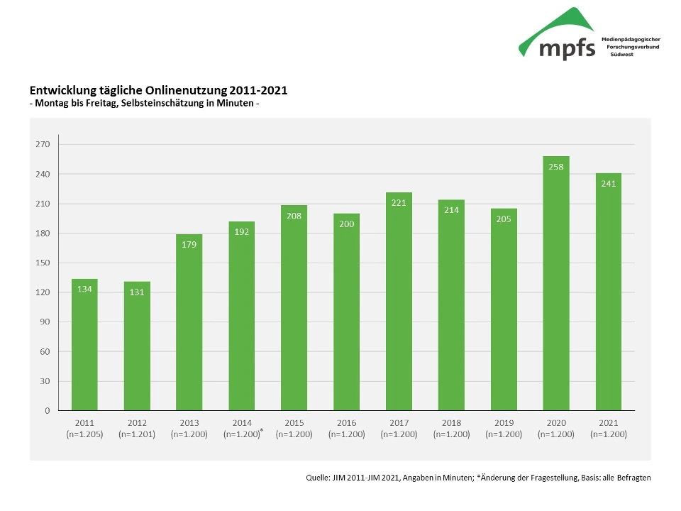 Um nichts zu verpassen, müssen Jugendliche „immer on“ sein. Es herrscht ein Gruppenzwang, dass Kommentare und Beiträge möglichst zeitnah gelesen und beantwortet werden. Diese Omnipräsenz ist ein Zeitfresser und führt dazu, dass die Zeiten, die junge Menschen online verbringen, weiter steigen. So stieg die tägliche Onlinenutzungszeit Jugendlicher von 134 Minuten im Jahr 2011 auf 241 Minuten im Jahr 2021 (vgl. mps, 2021, 55). Ein solches Verhalten kann suchtähnliche Formen annehmen.