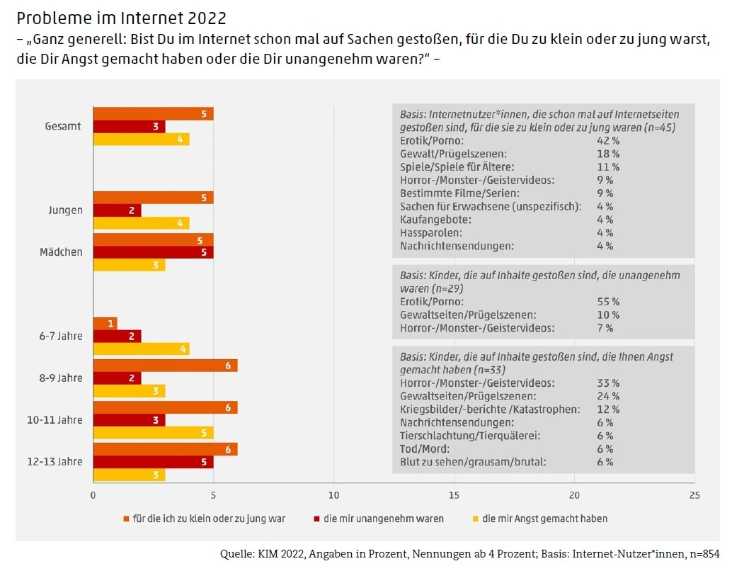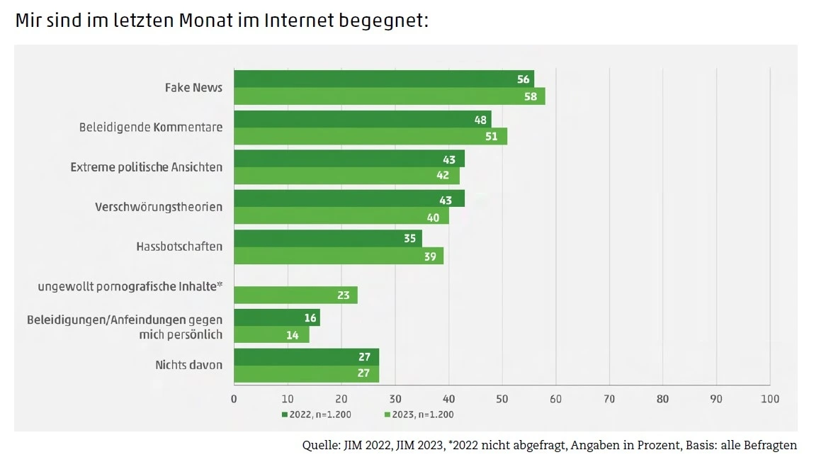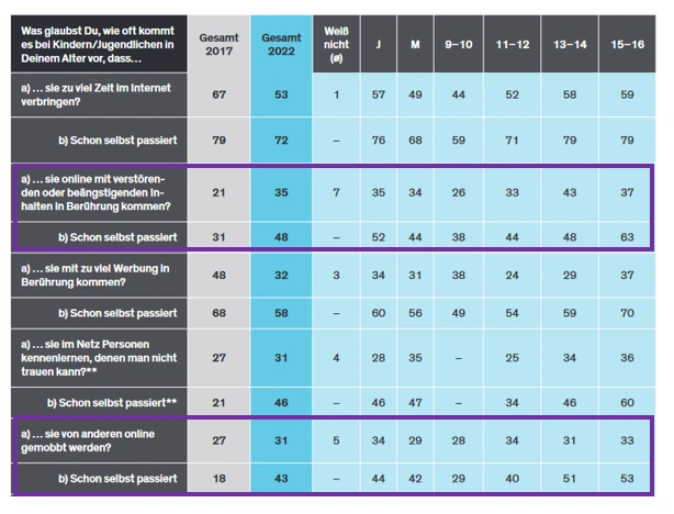Bei der Umfrage zum Jugendmedienschutzindex 2022 wurden Kinder und Jugendliche nach ihrer Selbsteinschätzung bzgl. ihrer sicherheitsrelevanten Online-Fähigkeiten befragt. Viele geben an, über diese Fähigkeit zu verfügen. So können beispielsweise 78% andere Personen von ihrer Kontaktliste entfernen und 77% der Befragten wissen, wie ein Screenshot funktioniert, um mögliche Beweise vorweisen zu können. Bei den allgemeinen Online-Fähigkeiten ist im Vergleich zu 2017 eine Zunahme zu verzeichnen. Ausbaufähig ist der Bereich „Fake News“. 39% geben an, Informationen nicht nach ihrem Wahrheitsgehalt beurteilen zu können. Ein ähnlicher Anteil der Befragten (40%) weiß nicht, wie man digitale Medien sicherer machen kann, um sich beispielsweise vor ungewollten Inhalten zu schützen (vgl. Gebel u. a., 2024).