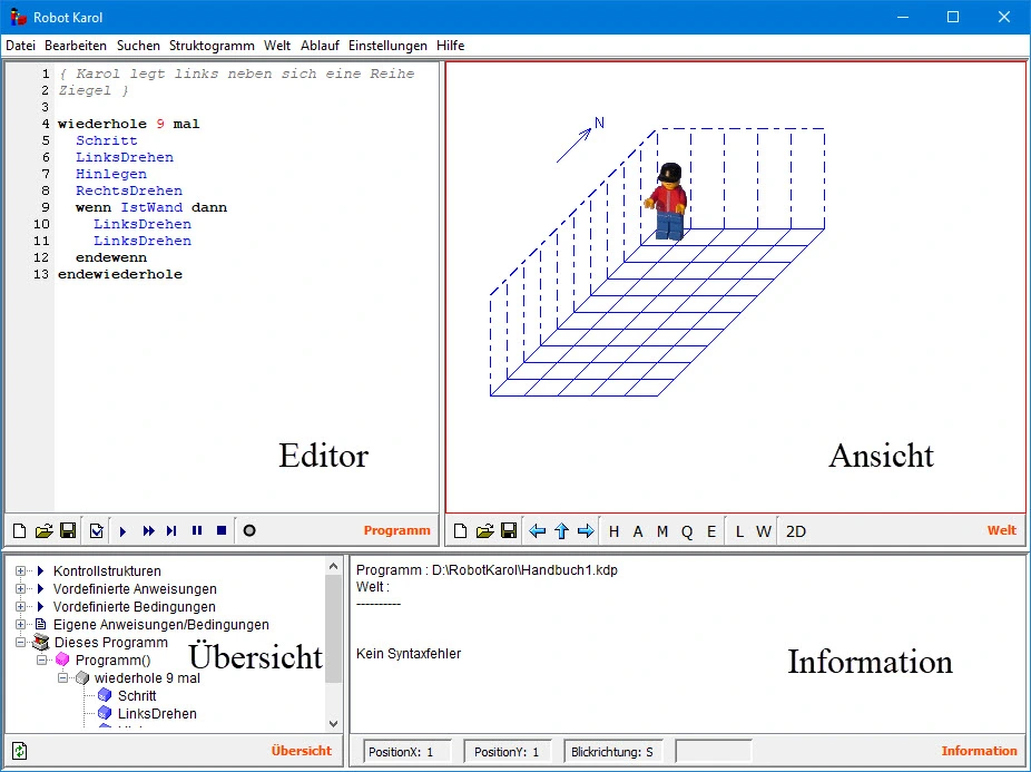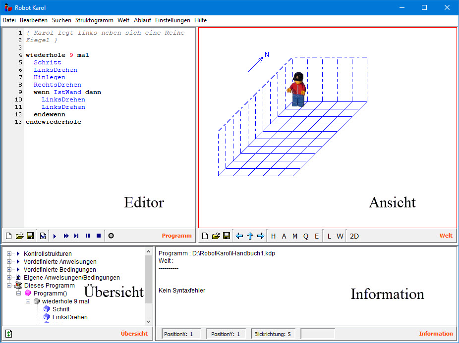 Das Hauptfenster der Programmierumgebung von Robot Karol umfasst die vier Teile Editor, Ansicht, Übersicht und Informationsfläche.