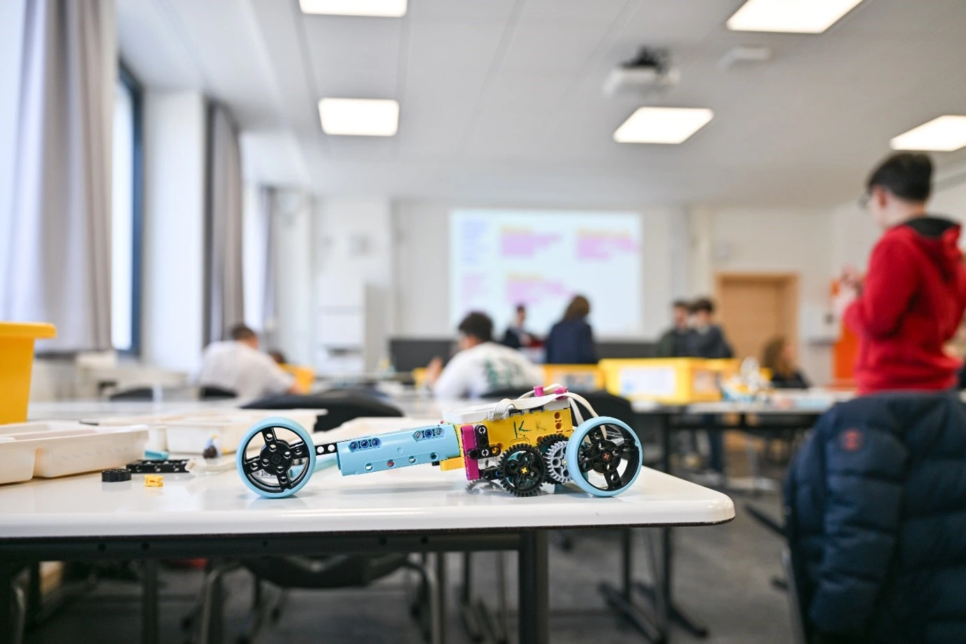 Im zweiten Halbjahr werden die Aufgaben zunehmend komplexer. Die Kinder programmieren mehrere Motoren, entwickeln eigene interaktive Modelle und setzen Bedingungen und Schleifen gezielt ein. Durch Storytelling-Projekte, in denen Roboter auf bestimmte Reize reagieren oder Geräusche erzeugen, wird die Kreativität zusätzlich gefördert. Gruppenarbeiten und kleine Wettbewerbe sorgen für zusätzliche Motivation und stärken soziale Kompetenzen. In den letzten Monaten des Schuljahres haben die Kinder die Möglichkeit, eigene Projekte zu entwickeln und ihre Ergebnisse vorzustellen. Diese Abschlussphase dient der Reflexion und gibt Raum für individuelle Entfaltung.
