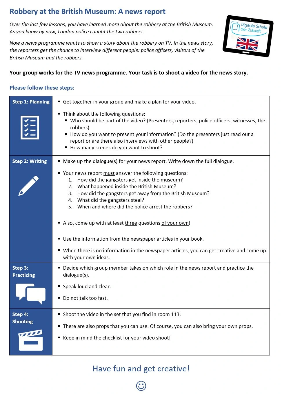 Im Fokus der vorliegenden Unterrichtseinheit steht nun der kreative Umgang mit den Texten. Für das Video erarbeiten die Schülerinnen und Schüler zunächst ein Drehbuch für den Beitrag in einer fingierten Nachrichtensendung. Nach diesem ersten Planungsschritt verfassen sie die Dialoge, welche die Schülerinnen und Schüler für ihren Nachrichtenbeitrag benötigen. Hier geben sie die Inhalte der Zeitungsartikel aus einer neuen Perspektive wieder. Außerdem können sie die Erzählung um eigene Ideen ergänzen. Im nächsten Schritt üben die Gruppen ihre Dialoge. Schließlich produzieren sie ihre Videos und bereiten diese visuell ansprechend auf.