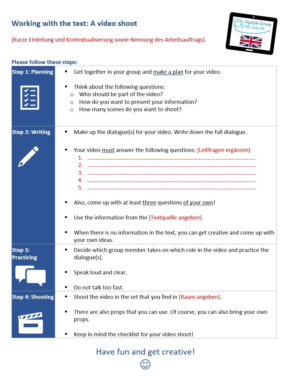 Für die Erstellung des Videos werden eine einfache Kulisse sowie Requisiten in einem angrenzenden Klassenzimmer zur Verfügung gestellt, in der jede Gruppe nacheinander ihr Video drehen kann (siehe Arbeitsauftrag).