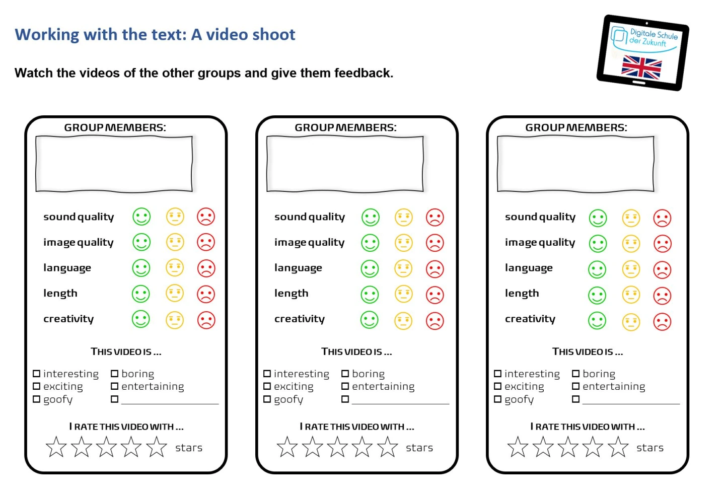 Die fertigen Videos werden im Klassenverband angesehen. Dabei füllen die Mitschülerinnen und Mitschüler ein Bewertungsraster aus, welches den Gruppen Rückmeldung zu ihren Produkten gibt.