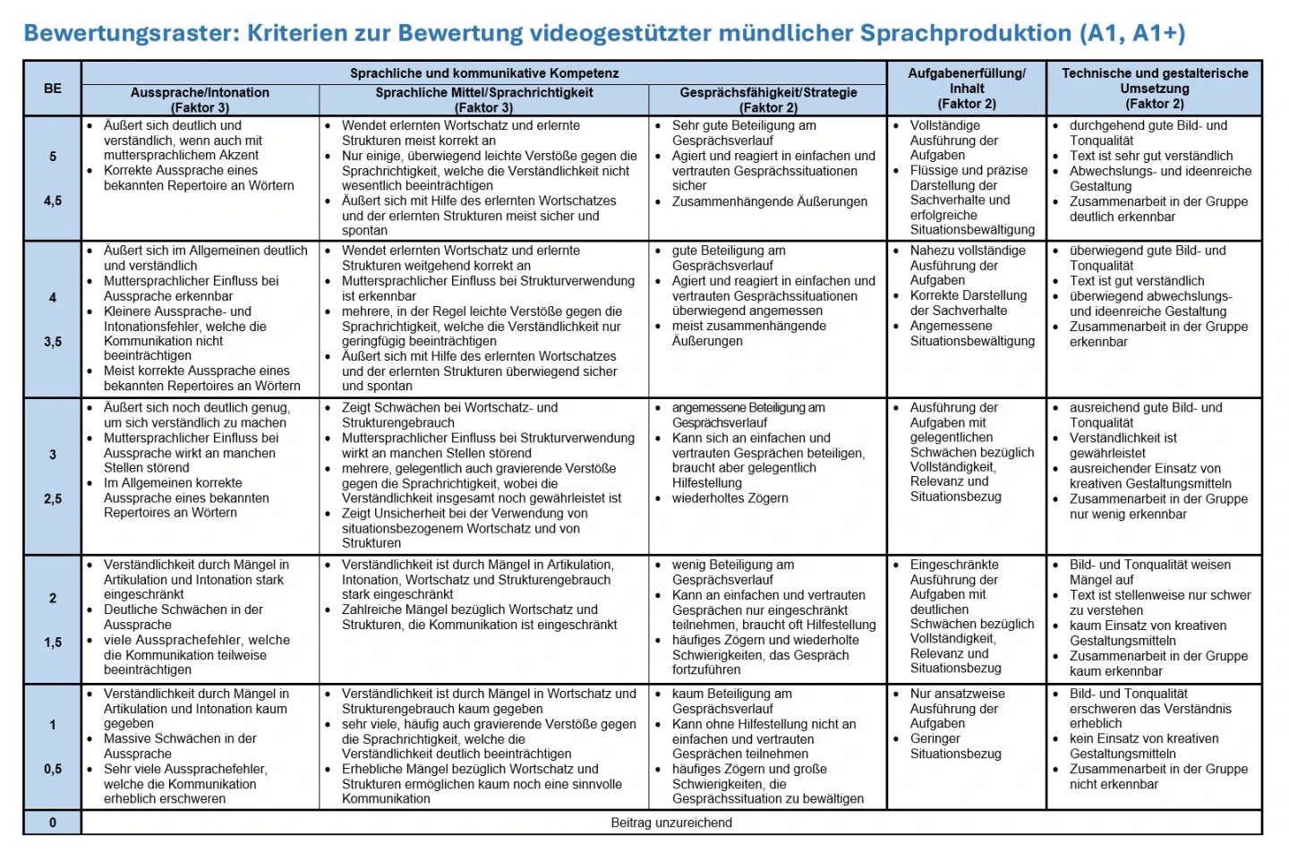 Die Gruppen reichen ihre Videos über eine geeignete Lernplattform ein. Die Lehrkraft bewertet die Produkte anschließend mithilfe einer adaptierten Version des ISB-Bewertungsrasters für mündliche Sprachproduktion. Dieses wird um den Aspekt „technische und gestalterische Umsetzung“ erweitert. So kann der Beitrag eines jeden Lernenden bewertet werden.