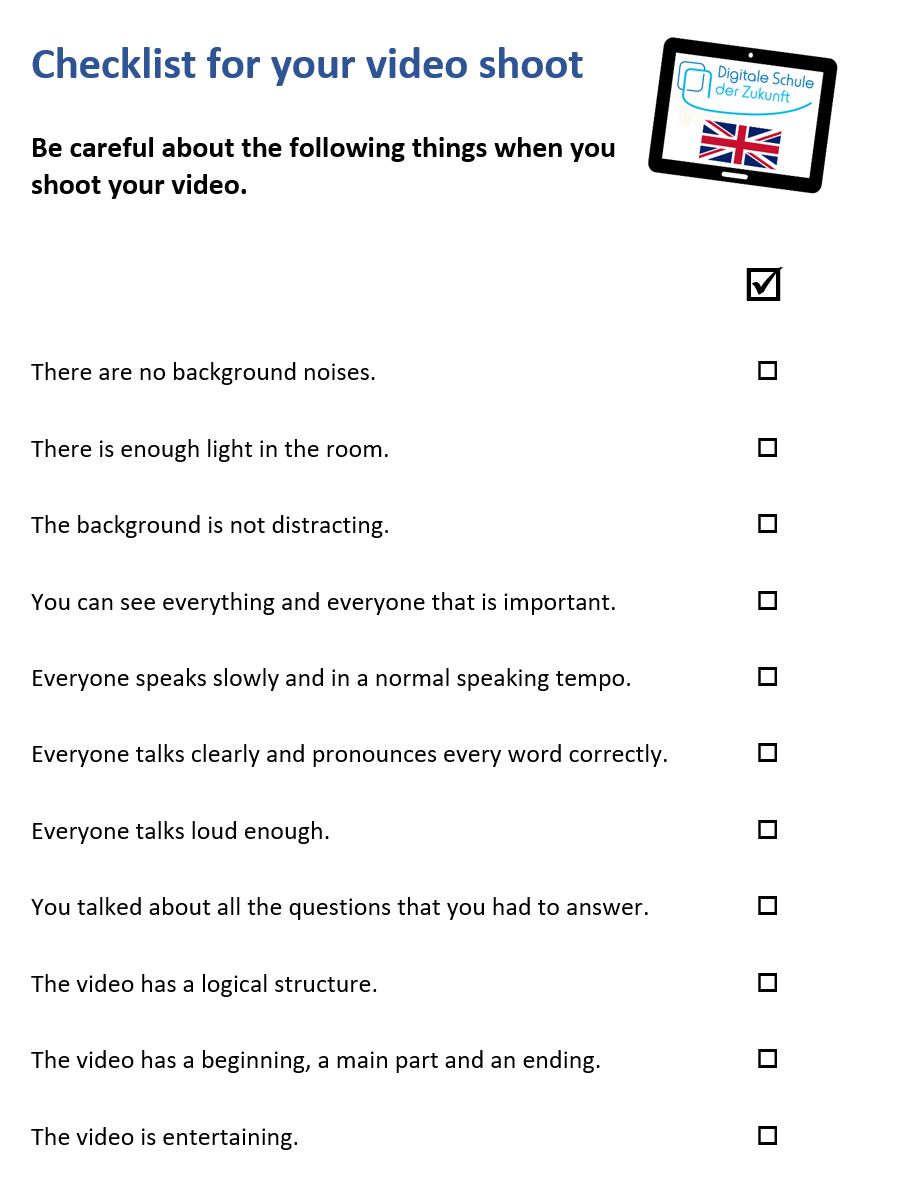 Die Gruppen erhalten außerdem eine Checkliste mit Kriterien, die sie bei der Produktion der Videos berücksichtigen müssen.