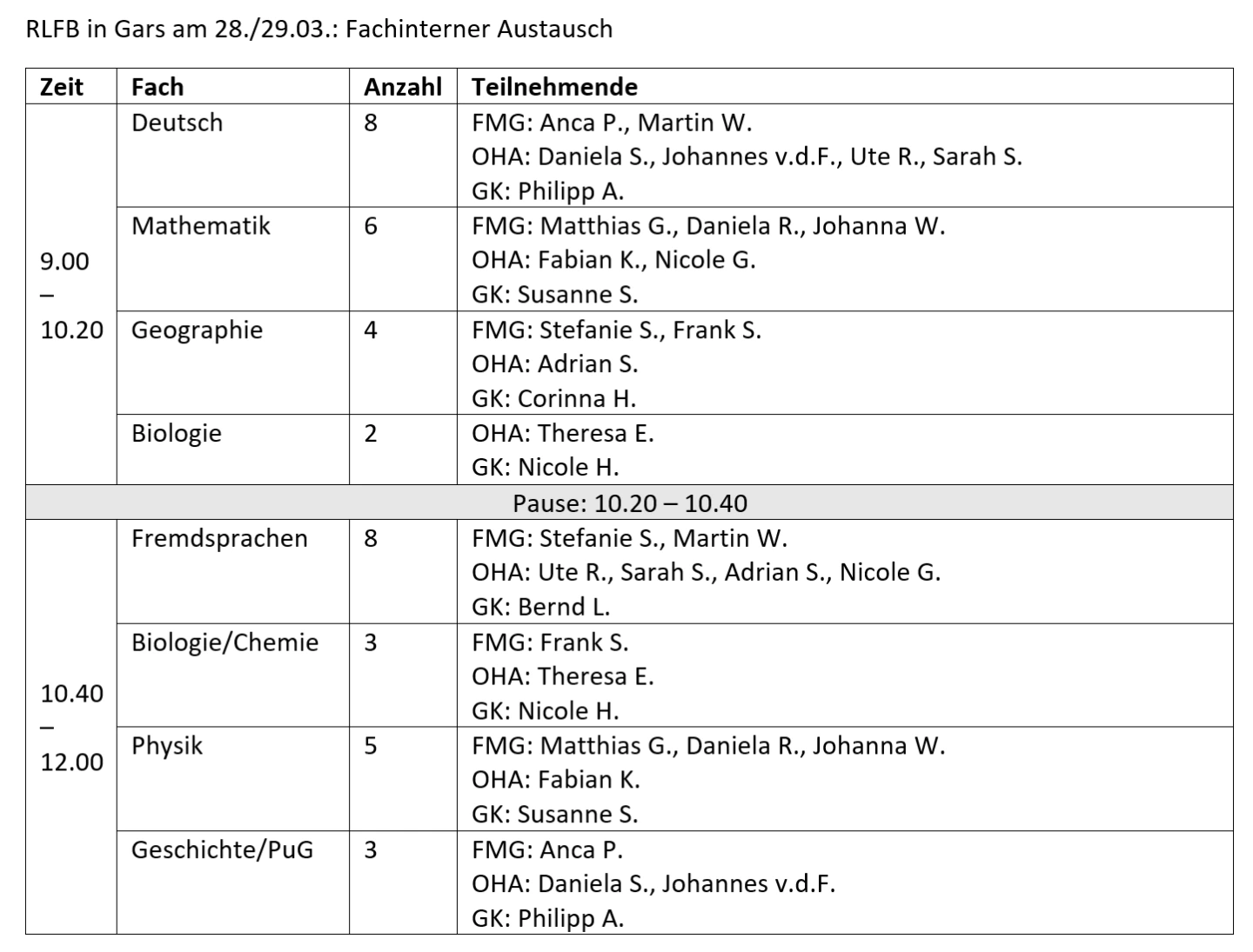 Im Vorfeld wurden ausgehend von den Fächerverbindungen der teilnehmenden Kolleginnen und Kollegen eine Einteilung für den fachinternen Austausch vorgenommen. Vor Ort arbeiteten die Lehrkräfte je nach Fächerverbindung in Kleingruppen zusammen.