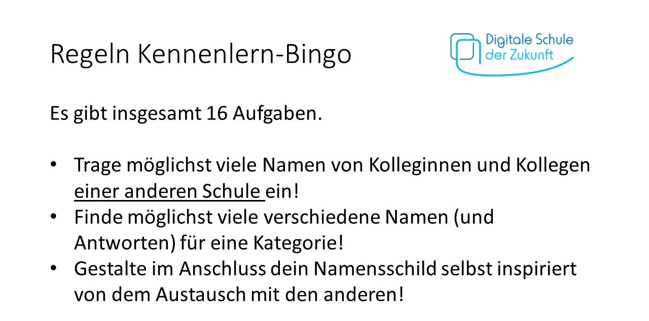 Als Alternative zu einer klassische Vorstellungsrunde kann man das Kennenlernen spielerisch gestalten. Beim Kennenlern-Bingo geht es darum, sich mit möglichst vielen Personen anhand vorgegebener Fragen auszutauschen. So kommt man auch auf einer persönlichen Ebene ins Gespräch und man schafft gleich zu Beginn der Veranstaltung eine lockere Atmosphäre.