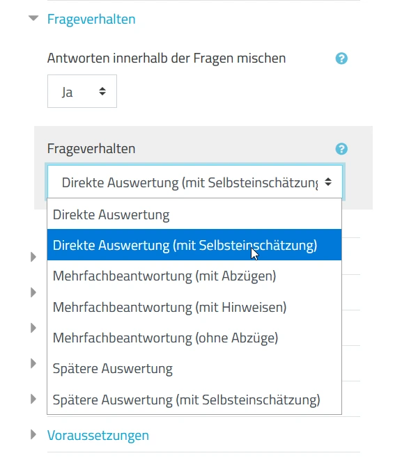 Auch wenn Selbsteinschätzungsbögen auf keinen Fall mit Leistungserhebungen in Verbindung gebracht werden sollten, bietet die Aktivität „Test” ebenso umfangreiche Möglichkeiten sich selber zu testen und die Ergebnisse unter den persönlichen Bewertungen einzusehen. Mit einem Prätest und Posttest dem Lernenden seine Leistungssteigerung aufgezeigt werden.