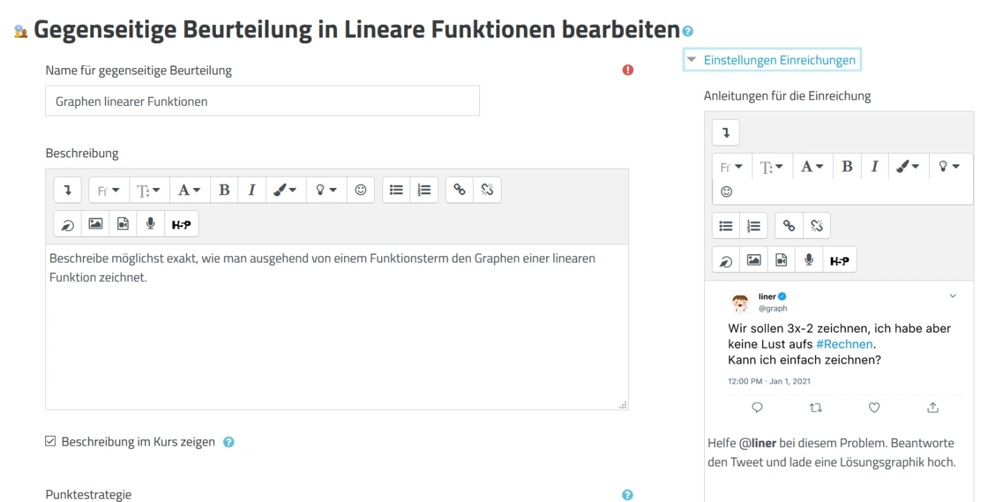 In der mebis Lernplattform steht für die systematische Durchführung von Peer-Feedback die Aktivität „Gegenseitige Beurteilung“ zur Verfügung. Als mögliche Aufgabenstellung erhalten die Lernenden den Auftrag, eine Zusammenfassung zu einem Lernbereich zu verfassen. Der Text wird anschließend von den Mitlernenden auf der Grundlage vorher festgelegter Kriterien hin überprüft und es wird eine entsprechende Rückmeldung verfasst. Aus dieser können die einzelnen Schülerinnen und Schüler ihren individuellen Lernstand zum Thema ableiten.