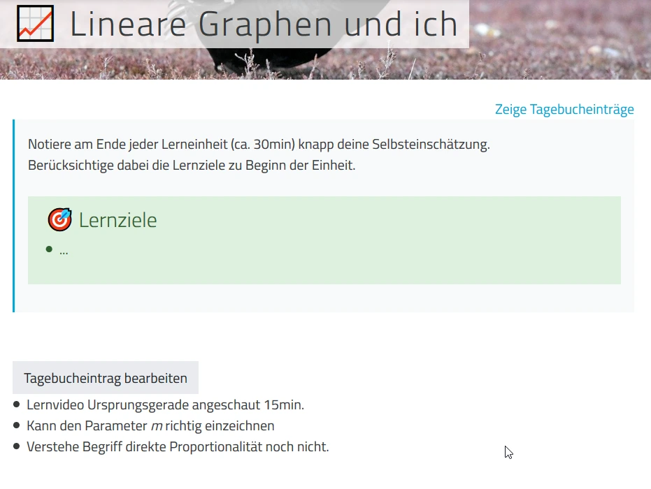 Durch die eigenständige Dokumentation der Lernfortschritte in Lerntagebüchern findet findet eine bewusste Vergegenwärtigung von bereits erreichten und noch ausstehenden Lernzielen. Es empfiehlt sich, die Dokumentation kontinierlich zu führen. Die Lernenden setzen sich immer wieder mit ihren Lernständen auseinander und können das Erreichen von Zielen überprüfen.