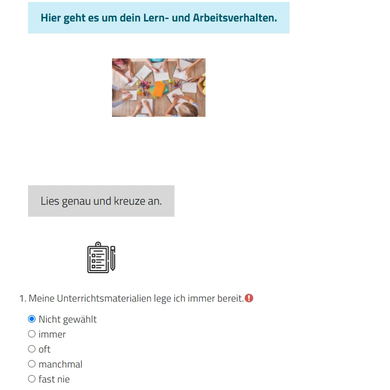 Der Kurs ist als Fragebogen angelegt. In zwei aufeinanderfolgenden Teilen werden Fragen zu Lern- und Arbeitsverhalten sowie zum Sozialverhalten gestellt. Die Antwortmöglichkeiten sind bei allen Fragen gleich: immer, oft, manchmal, fast nie
