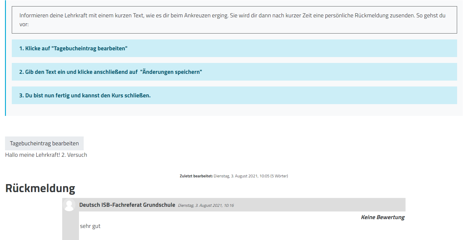 Die Rückmeldung erfolgt durch die Lehrkraft. Wichtig ist ein dialogischer Austausch auf Augenhöhe mit den Schülerinnen und Schülern über die Ergebnisse ihrer Selbsteinschätzung und die Beobachtungen der Lehrkraft. Dabei werden Handlungsempfehlungen für die individuelle Entwicklung angesprochen. In der Grundschule bietet es sich häufig an, das persönliche Gespräch mit den Lernenden zu suchen. Aber auch ein Feedback in schriftlicher Form über mebis ist denkbar.