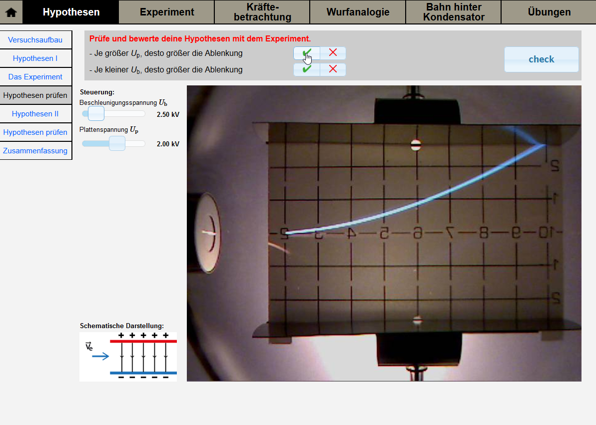 Behandelt werden klassische Versuchsaufbauten, wie etwa die Elektronenablenkröhre. Die Lernenden erarbeiten sich anhand einer schematischen Skizze den Aufbau und Funktion des Experiments und das Wissen wird stets durch interaktive Übungen gesichert. Ein realistisches virtuelles Experiment verbindet die Theorie mit der Praxis und im weiteren Verlauf können Hypothesen überprüft werden und die mathematische Beschreibung erarbeitet werden. Zum Abschluss sichern die Schülerinnen und Schüler ihr Wissen durch Quizze und können sich bei bereitgestellten Abituraufgaben samt Lösungen testen.