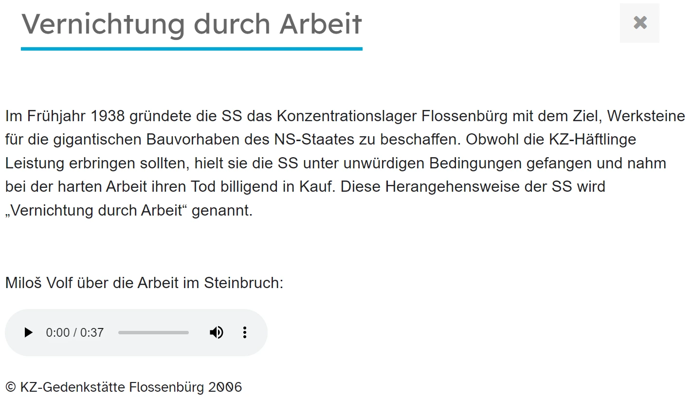 Entwickelt wurde der Kurs von der Bildungsabteilung der Gedenkstätte Flossenbürg. Der Einstieg in die Thematik erfolgt mit einem ca. 10-minütigen Video. In diesem berichten ehemalige Inhaftierte von ihrem Schicksal im Konzentrationslager Flossenbürg und ihrer Zwangsarbeit im Steinbruch und der Rüstungsproduktion. Die Moderatoren zeigen zudem die Bedeutung des Steinbruchs für die Nationalsozialisten sowie das Verhalten der SS und der Kapos auf.