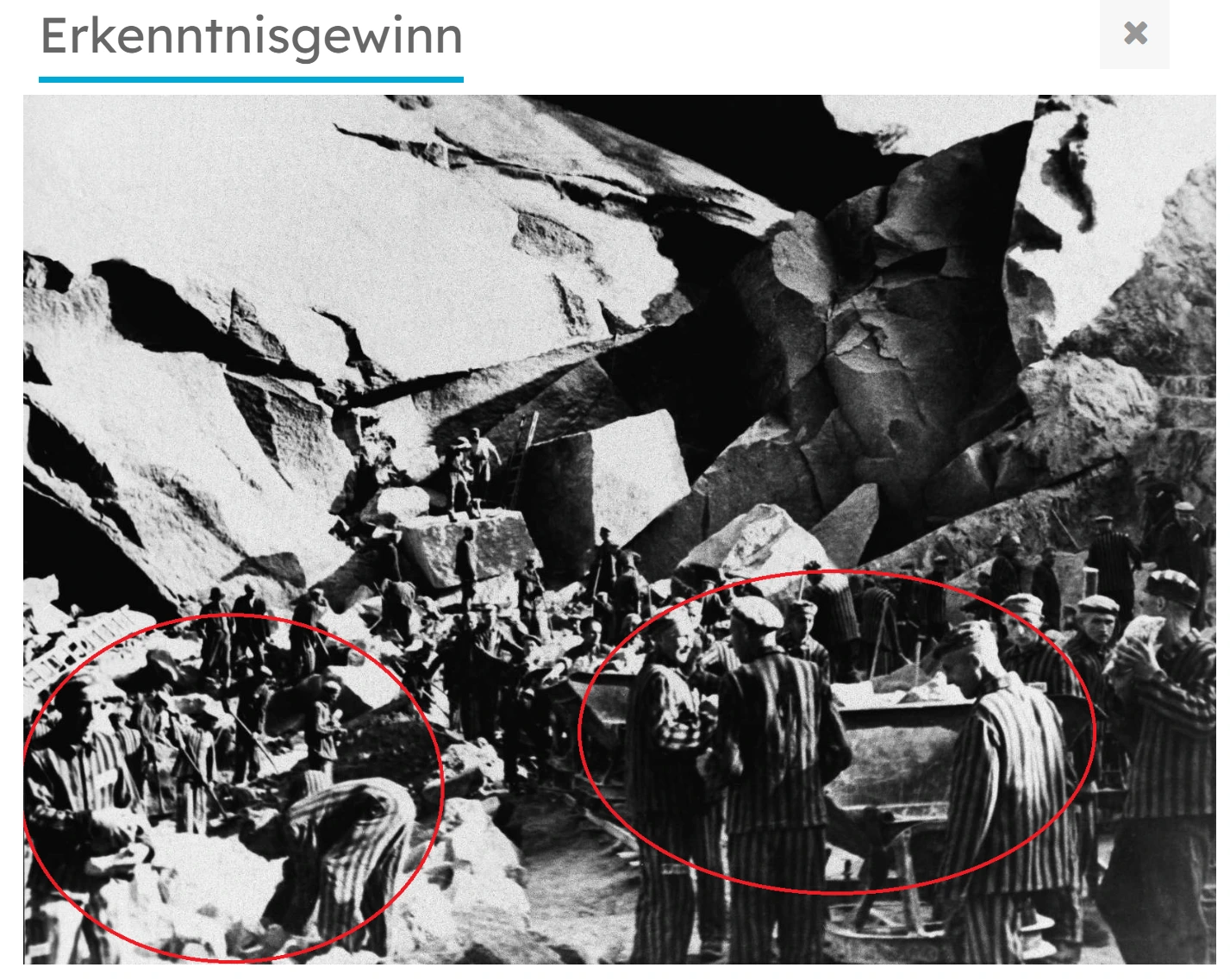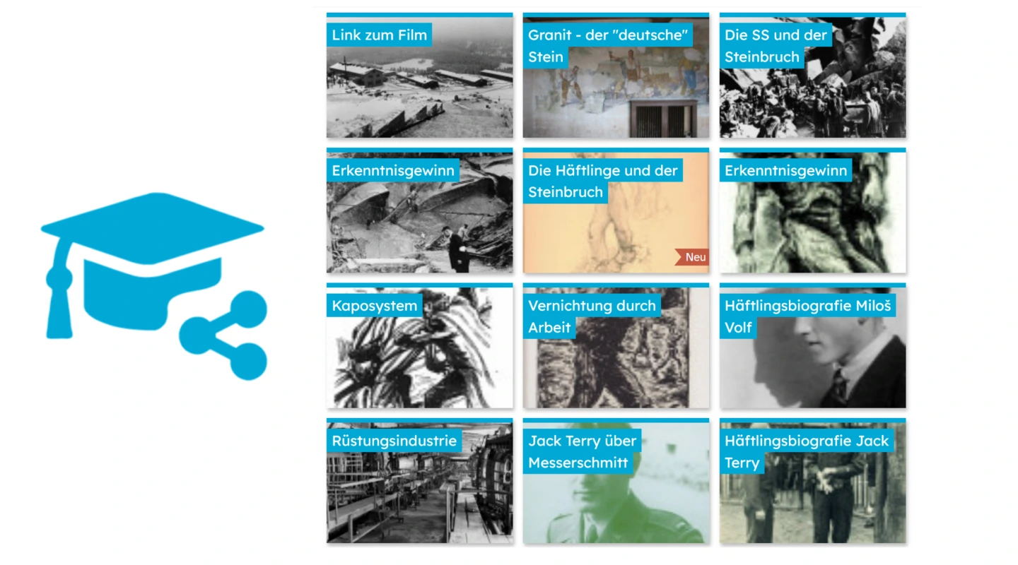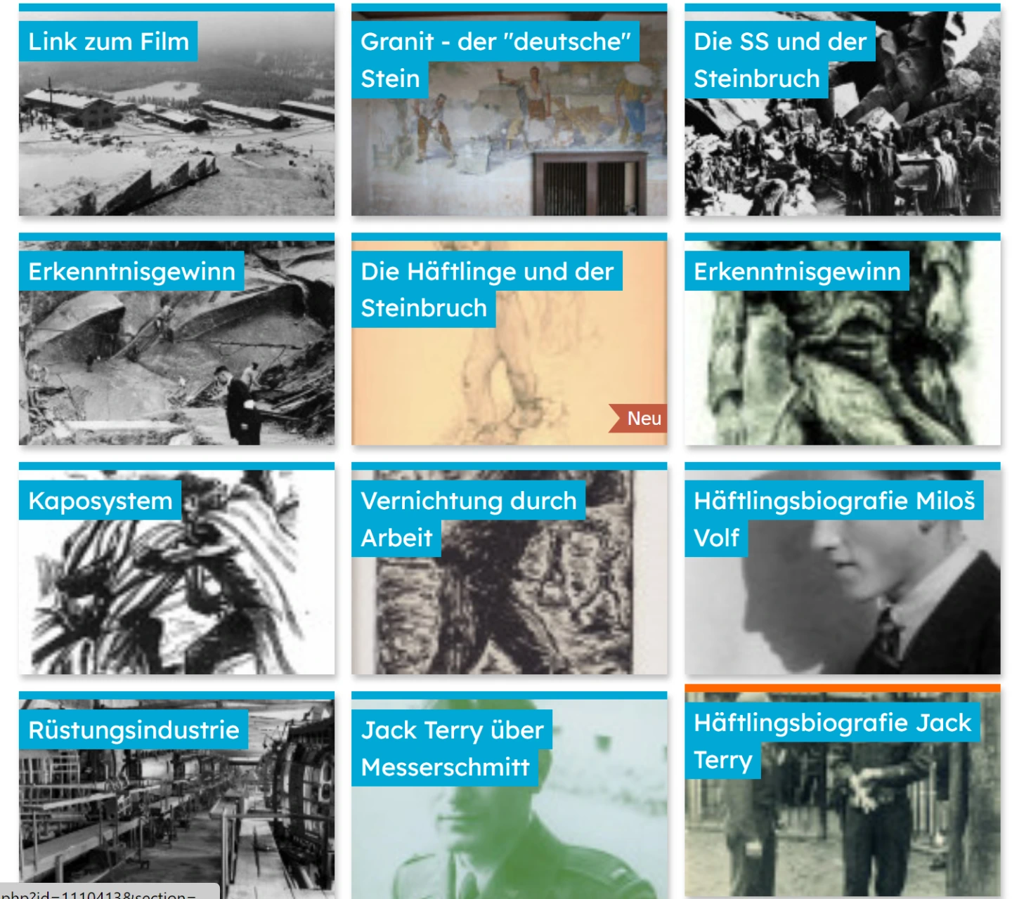 In logischer Reihenfolge bauen die weiteren zwölf Abschnitte auf die Inhalte im Video auf. So werden beispielsweise die Kapitel Granit – der „deutsche“ Stein, die SS bzw. die Häftlinge und der Steinbruch, das Kaposystem, Vernichtung durch Arbeit, die Rüstungsindustrie und Häftlingsbiografien behandelt.