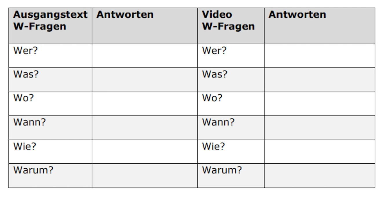 Die Schülerinnen und Schüler überlegen sich, wie sie den Basistext mit seinen zentralen Inhalten in eine kurze Geschichte umwandeln können. Dabei sollten sie darauf achten, dass ein Großteil der Antworten auf die W-Fragen des Ausgangstextes und der von ihnen neu entwickelten Story gleich sind. Somit ist ein konkreter Bezug zum Basistext gegeben.