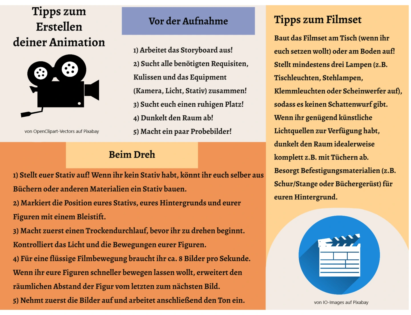 Die Lernenden werden in die Technik des Stop-Motion-Films eingeführt. Dies kann entweder durch die Anleitung der Lehrkraft oder durch ein Erklärvideo erfolgen.