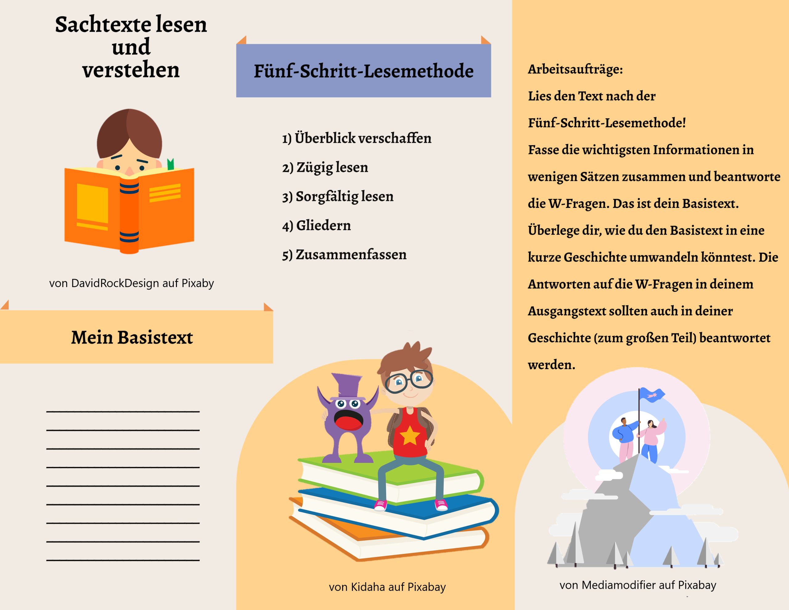 Um den Schülerinnen und Schülern einen ganz anderen Zugang zu ermöglichen, soll am Ende der Unterrichtseinheit die kreative Beschäftigung mit pragmatischen Texten auf dem Plan stehen. Die Lernenden müssen sich dennoch vertieft mit einem Text auseinandersetzen (z.B. anhand der Fünf-Schritt-Lesemethode) und ein klarer Themenbezug des Endprodukts zum Sachtext soll erkennbar sein. Die produktive Aufgabe für die Schülerinnen und Schüler aber ist es, den pragmatischen Text, also den sachlichen Inhalt, in einen Stop-and-Motion-Film, eine Geschichte mit (spannender) Handlung, umzuformen.