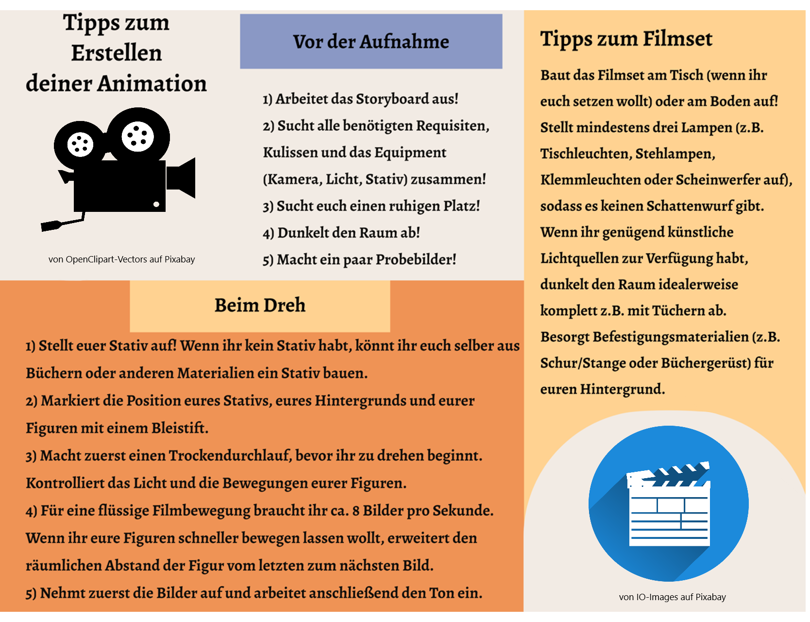 Es muss bei einem Stop-Motion-Film vor allem darauf geachtet werden, die Fotos im gleichen Licht und aus der gleichen Position zu erstellen. Einfache Hilfen bieten z. B. Notenständer oder aus zusammensetzbaren Bausteinen gebastelte Halterungen für das Tablet oder das Handy. Natürlich funktioniert das noch besser mit höhenverstellbaren und flexiblen Stativen.