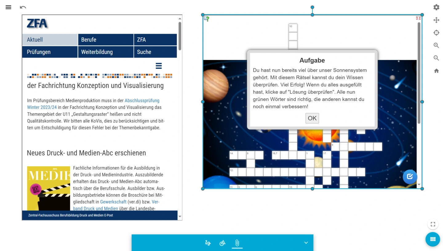 Nutzen Sie auch die Möglichkeiten, interaktive Elemente in das Tafelbild zu integrieren. Beispielsweise können Sie Learning-Apps oder auch mit der Lernplattform erstellte H5P Aktivitäten (Interaktiver Inhalt) einbetten. Dazu benötigen Sie den Vollbild-Link zur Learning-App bzw. den „Einbetten”-Link zur H5P-Aktivität!