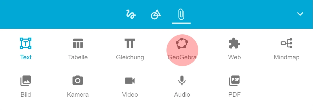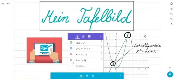 GeoGebra lässt sich in vollem Funktionsumfang in Ihr Tafelbild integrieren. Tipps zur Funktionsweise zu GeoGebra finden auf der Webseite https://www.geogebra.org/a/14.