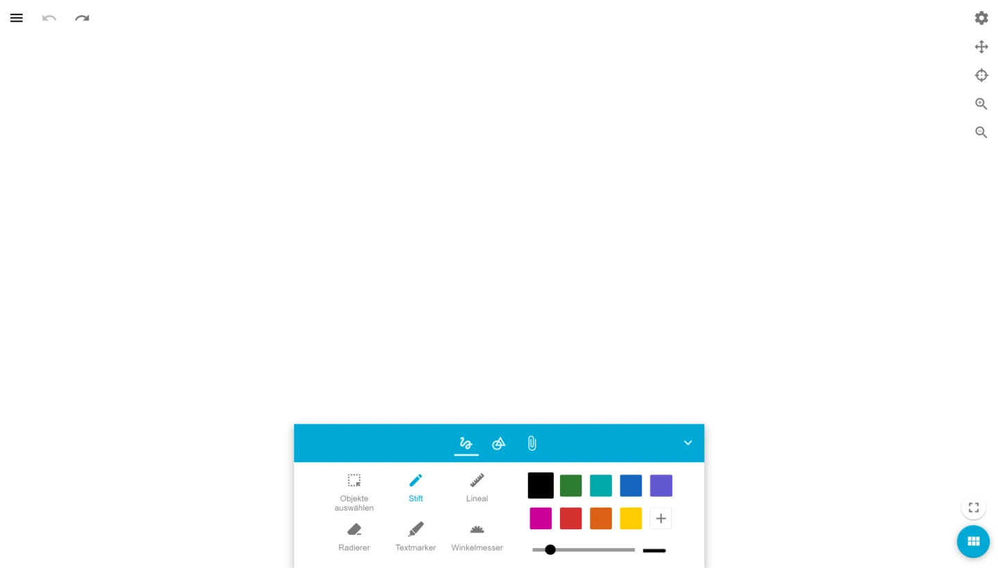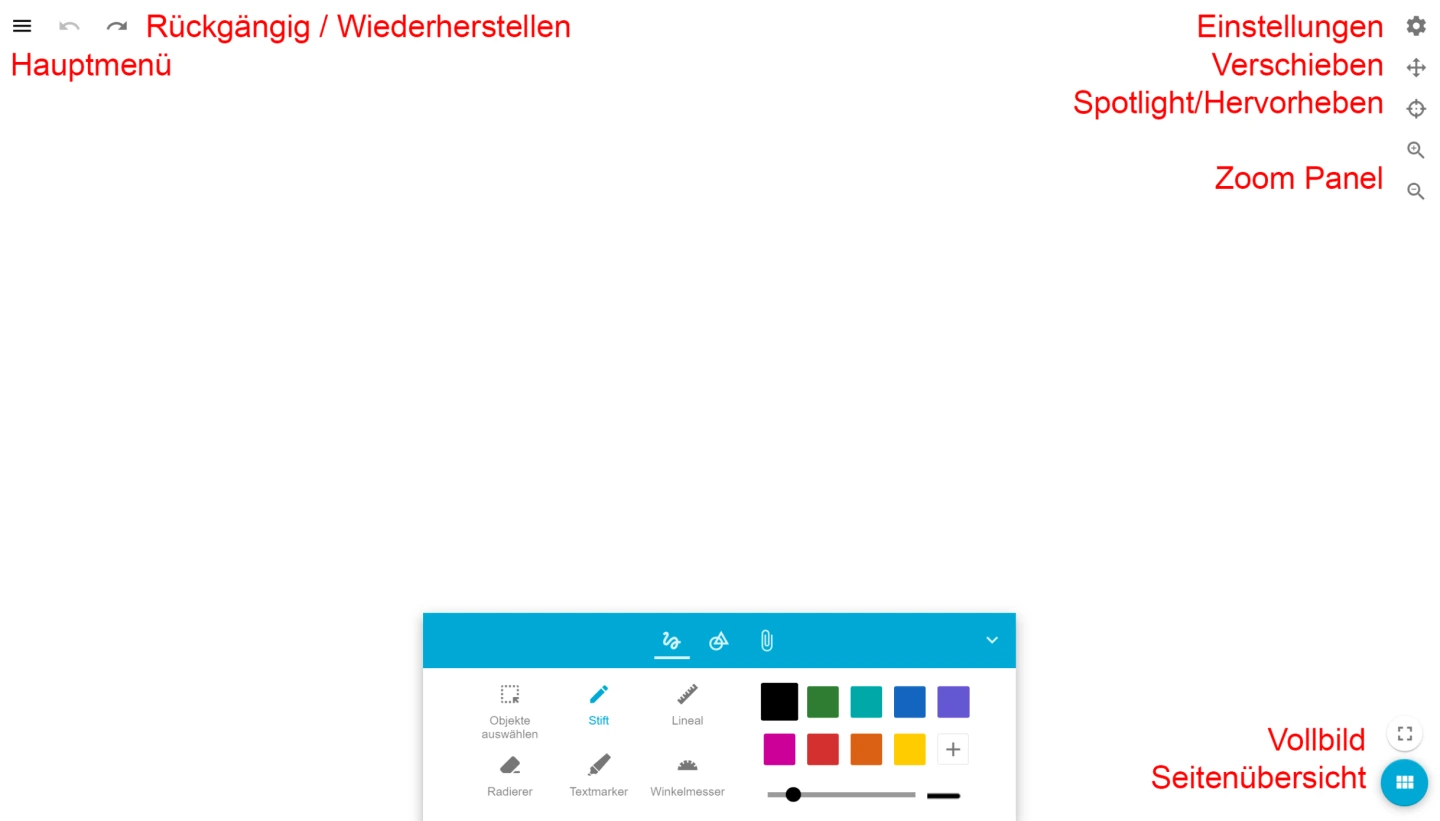 Die unendlich große Tafelfläche ermöglicht es, dass Sie Ihr Tafelbild in jede beliebige Richtung fortsetzen können. Nutzen Sie dazu die Seitensteuerung rechts oben. Klicken Sie auf das Pfeilkreuz. Mit dem Zoom Panel können Sie in die Tafelfläche hinein- und wieder herauszoomen. Das Zoom Panel steht bei Touchgeräten nicht zur Verfügung – der Zoom kann hier über die Gesten gesteuert werden.