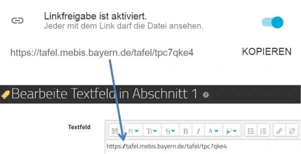 Sie können Tafelbilder ganz leicht in einen Kurs auf der Lernplattform integrieren. Kopieren Sie dazu den Freigabe-Link des gewünschten Tafelbildes und fügen Sie diesen in einem Textfeld auf der Lernplattform ein. Das Tafelbild wird dann automatisch in Ihrem Kurs angezeigt.