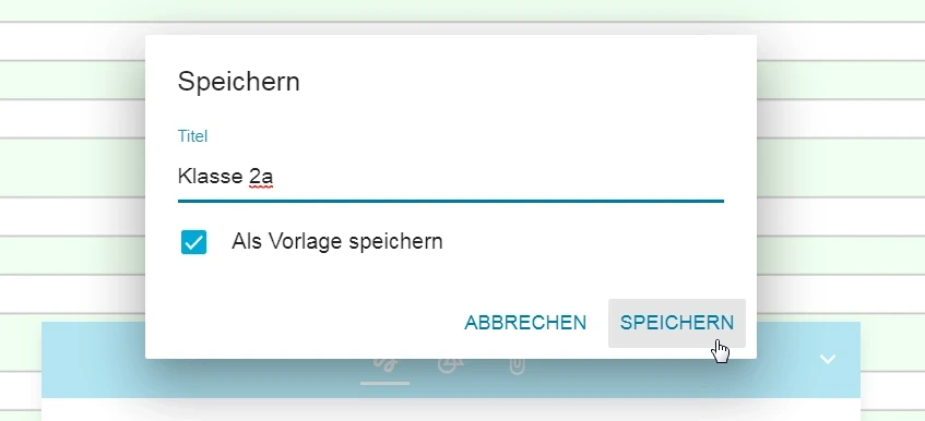 Als eingeloggter Nutzer können Sie mit der Tafel Ihre eigenen Tafelvorlagen erstellen und speichern. Wählen Sie für eine Vorlage zum Beispiel eine Hintergrundfarbe, eine Lineatur, die Stiftfarbe oder auch die Stiftdicke aus. Speichern der Vorlage erfolgt wie im vorhergehenden Abschnitt über das Seitenmenü der Tafel. Im Speicherdialog können Sie nun einen Haken bei als Vorlage Speichern setzen. Ein Klick auf Neue Datei bietet die Auswahl zwischen einer leeren Vorlage und Ihren abgespeicherten Vorlagen. Verwenden Sie eine Vorlage und speichern Sie ein damit erarbeitetes Tafelbild - ohne Haken bei Vorlage - so erscheint dieses Tafelbild wie gehabt in Ihren Tafeldateien. Die Vorlage ist wieder wie definiert über Neue Datei aufrufbar.