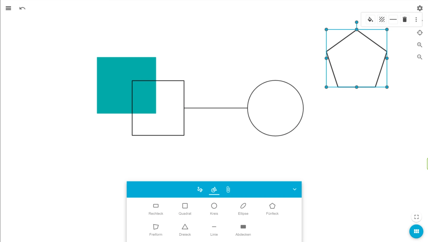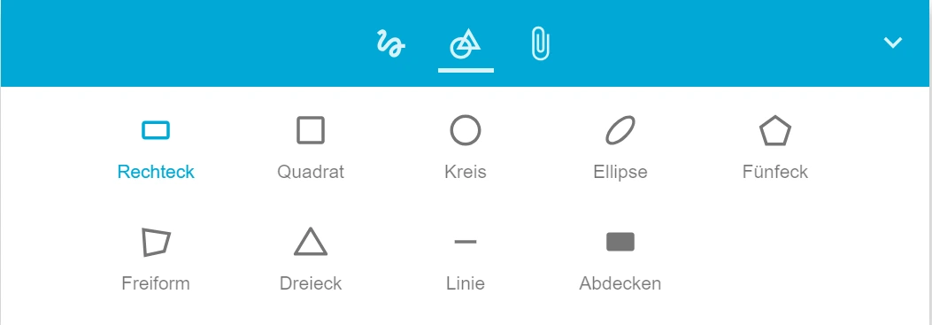 Es besteht die Möglichkeit verschiedene geometrische Formen zu verwenden, mit denen Sie Ihr Tafelbild strukturieren können. Mit dem Abdecktool steht ein bereits gefülltes Rechteck zur Abdeckung von Inhalten zur Verfügung. Dieses liegt immer in der obersten Ebene über anderen Objekten. Farbe und Größe können angepasst werden.