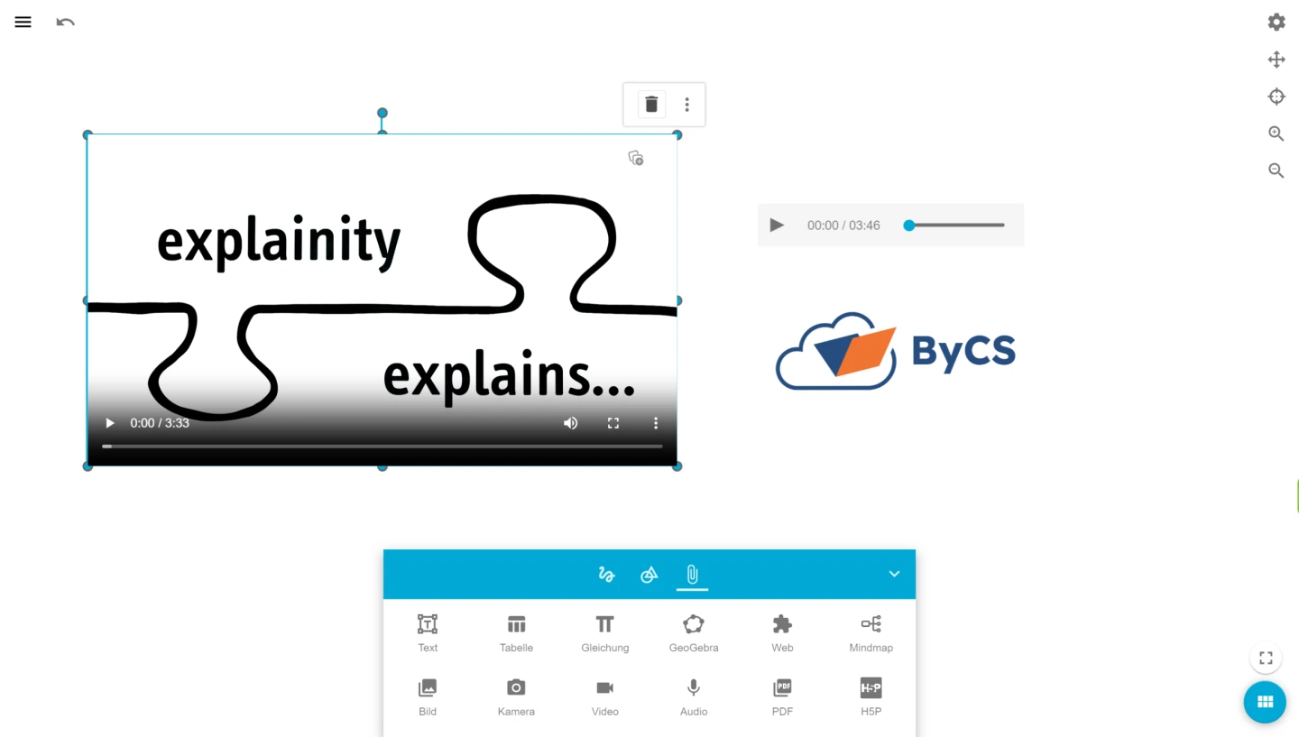 Analog zu den Audio-Inhalten können Sie auch Video-Elemente in das Tafelbild integrieren (einbetten). Nehmen Sie auch hierfür den Link für Tafel und Lernplattform mit H5P aus der Mediathek oder fügen eine beliebige online verfügbare mp4 – Quelle ein.