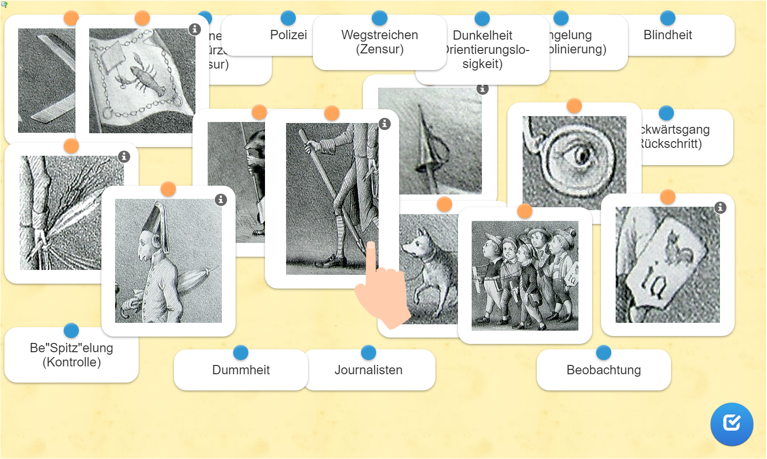 Die enge Lenkung innerhalb der Einheit dient dazu, dass die Schülerinnen und Schüler die übliche Vorgehensweise der Bildanalyse verinnerlichen. Die erste Aufgabe, in der sie Bildelemente und ihre Bedeutung zuordnen, soll dabei die Aufmerksamkeit auf Details lenken, die auf den ersten Blick leicht zu übersehen wären. Die Schülerinnen und Schüler können ihre eigenen Überlegungen dazu anstellen, was die Bildelemente bedeuten und zugleich überprüfen, ob sie richtig liegen (indem sie auf den blauen Knopf ganz rechts unten klicken). Zwar nimmt dies etwas Eigenleistung vorweg, jedoch wird dadurch gleichzeitig die eingehende Betrachtung einer Quelle noch vor der Beschreibung geschult, was eine Voraussetzung für die zielgerichtete Beschreibung und Interpretation ist.