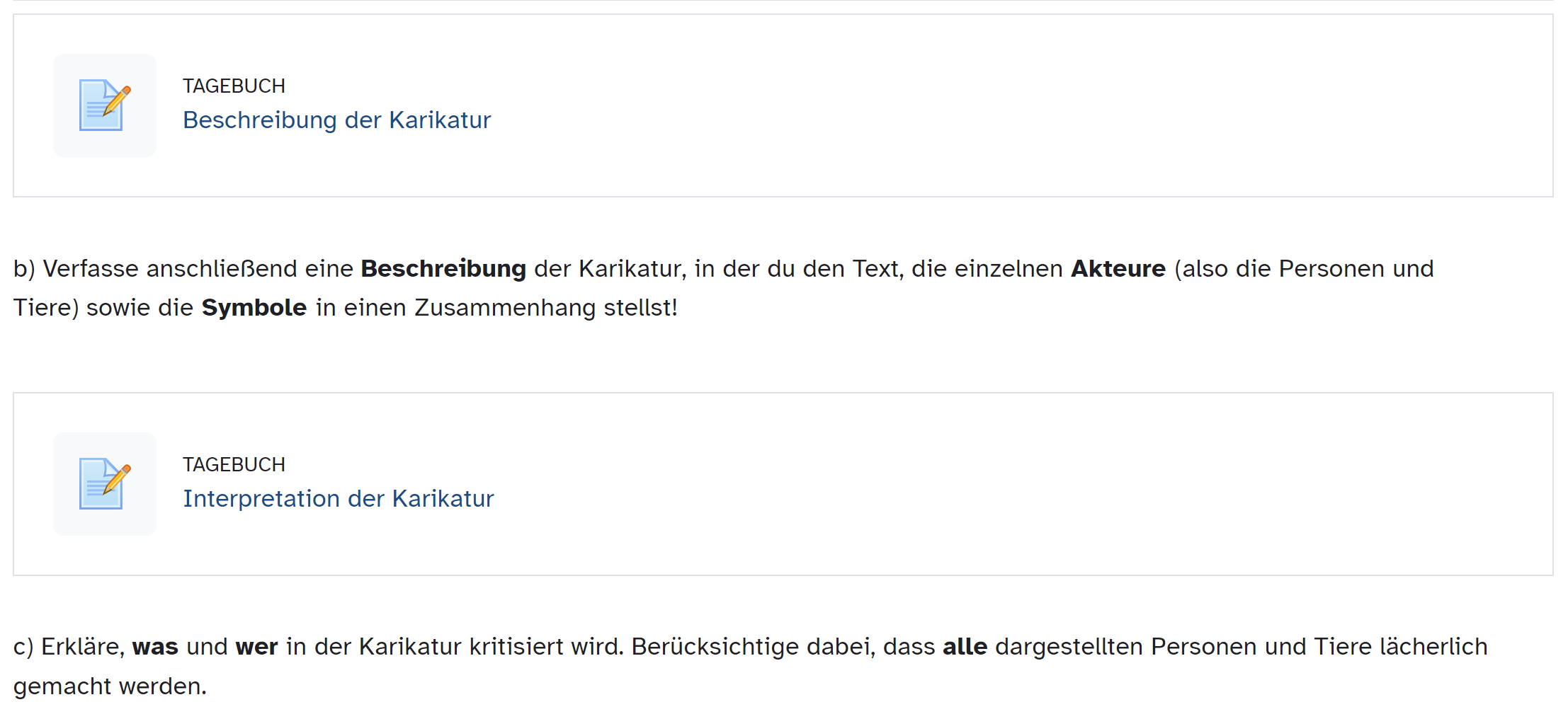 In der Folgestunde werden exemplarische Antworten der Schülerinnen und Schüler über die Funktion „Zeige Tagebucheinträge” gemeinsam (z. B. über den Beamer) vorgelesen und verglichen. Dabei sollte sich ergeben, was eine gute Analyse des Beispiels umfasst.